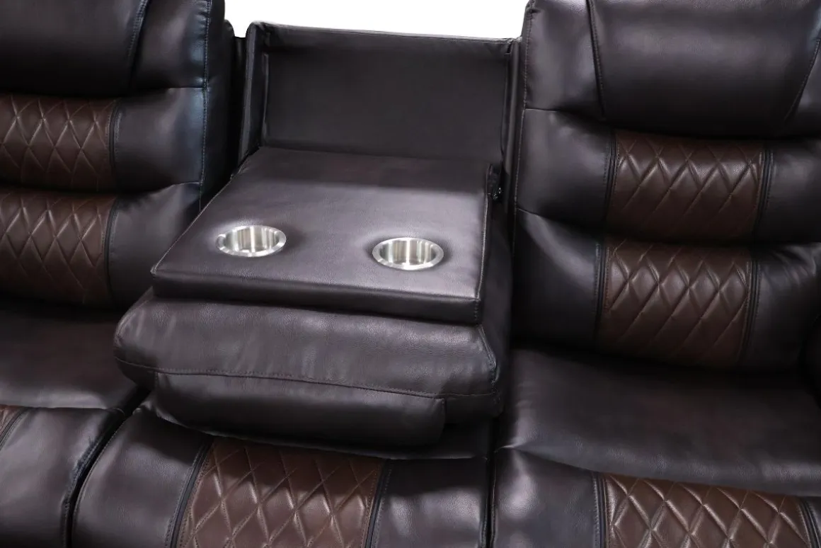 This exquisite Nikko Reclining Sofa in Brown is perfect for lounging or entertaining guests. The manual reclining feature allows you to easily adjust the sofa to your preferred position, and the lever mechanism ensures smooth and effortless reclining. The hardwood plywood frame and pocket coil seating provide durability and support. The drop-down center back adds convenience, providing a handy spot for snacks or remotes. And to keep your sofa looking its best, spot clean with a dry, solvent-based cleaner. Product Details: • Upholstered in rich brown faux leather for a luxurious look and feel • The built-in storage adds functionality • The padded armrests provide extra comfort