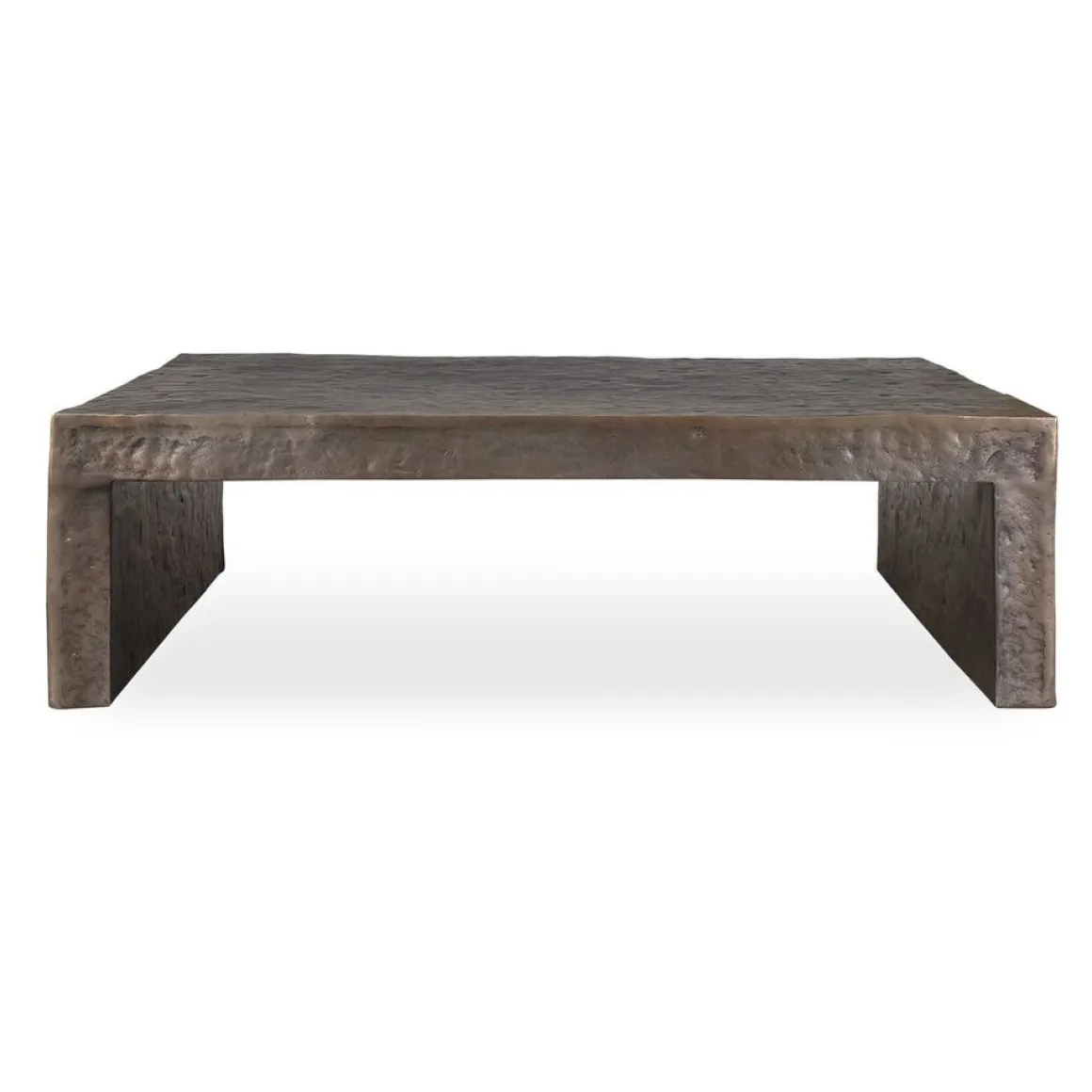 The Obra coffee table showcases a hammered textured aluminum frame in a captivating golden dark bronze finish. Its simple yet stylish design makes it perfect for any outdoor space, while its sustainable construction ensures years of enjoyment.