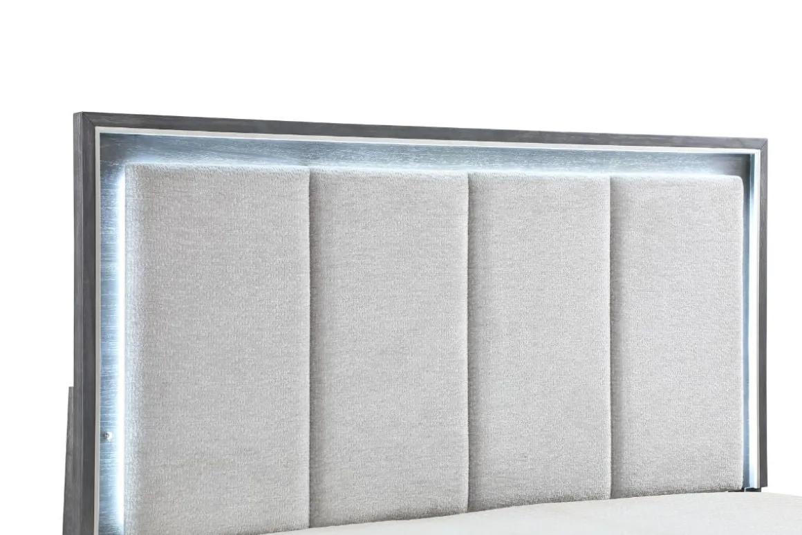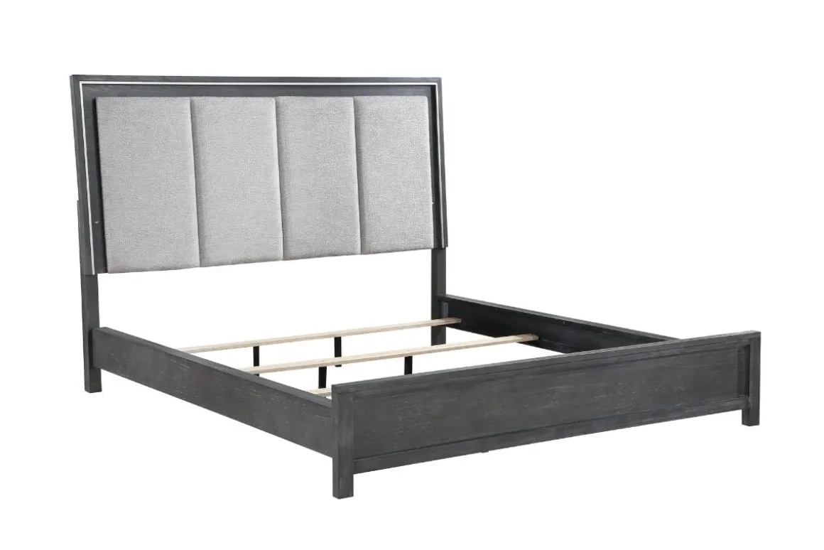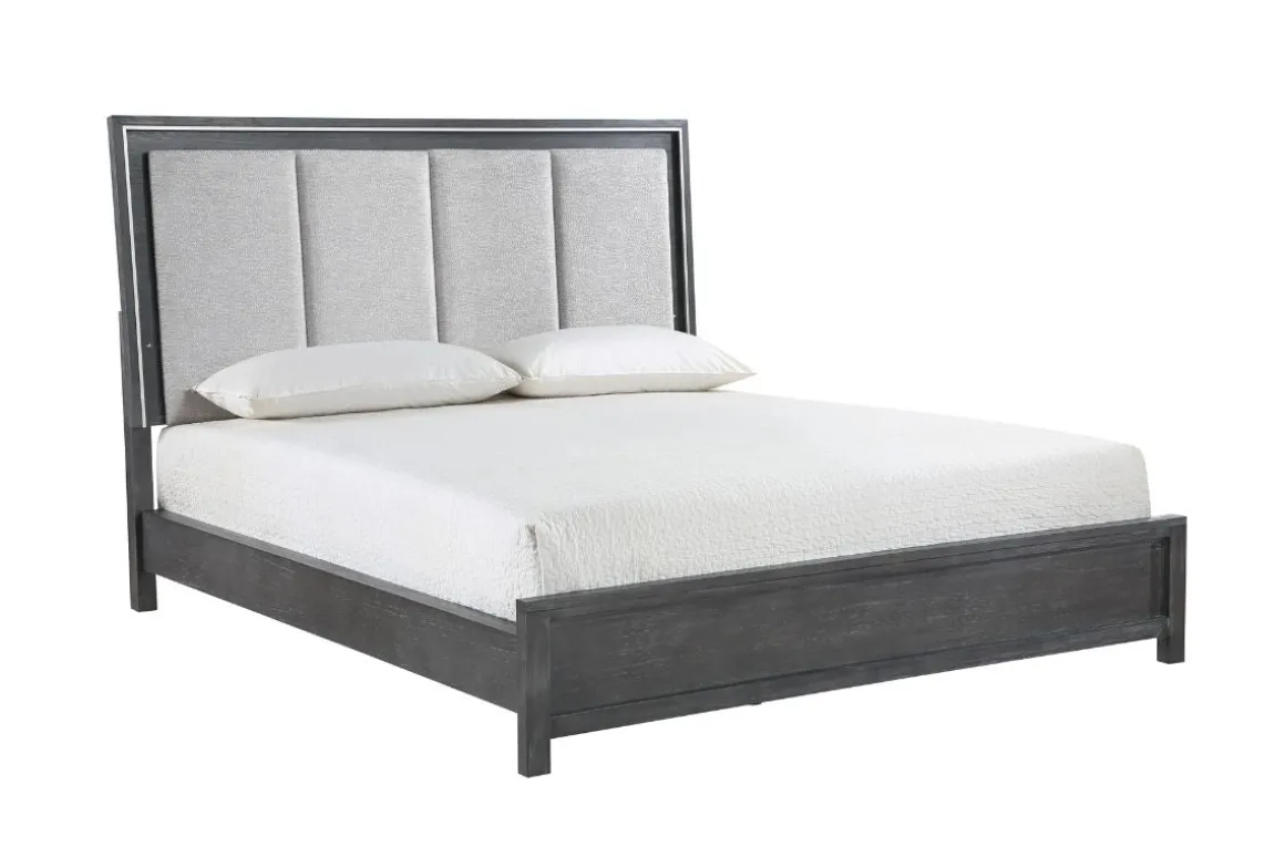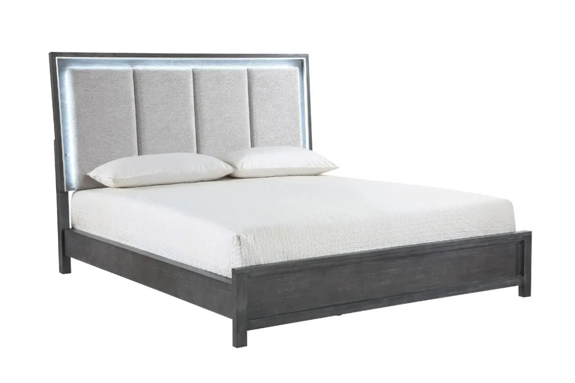 The Odessa Panel Bed in Charcoal, Queen is the ideal combination of contemporary design and comfort for your bedroom. This bed has a modern charm thanks to its panel design and sleek charcoal color. It will instantly improve the atmosphere of your space. The silver trim adds a touch of class while the padded headboard provides maximum comfort. Your room will have a stunning focal point thanks to the soft, inviting glow of the integrated LED lighting.