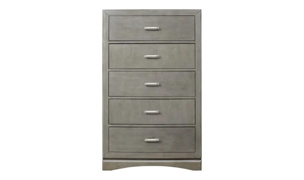 The Ontario Chest in Gray Rustic Oak is a stunning storage solution for any bedroom. Made with durable hardwoods and finished with an appealing gray color, this chest adds both style and functionality to your bedroom. With its five spacious drawers, it provides ample storage for all of your clothing and accessories.