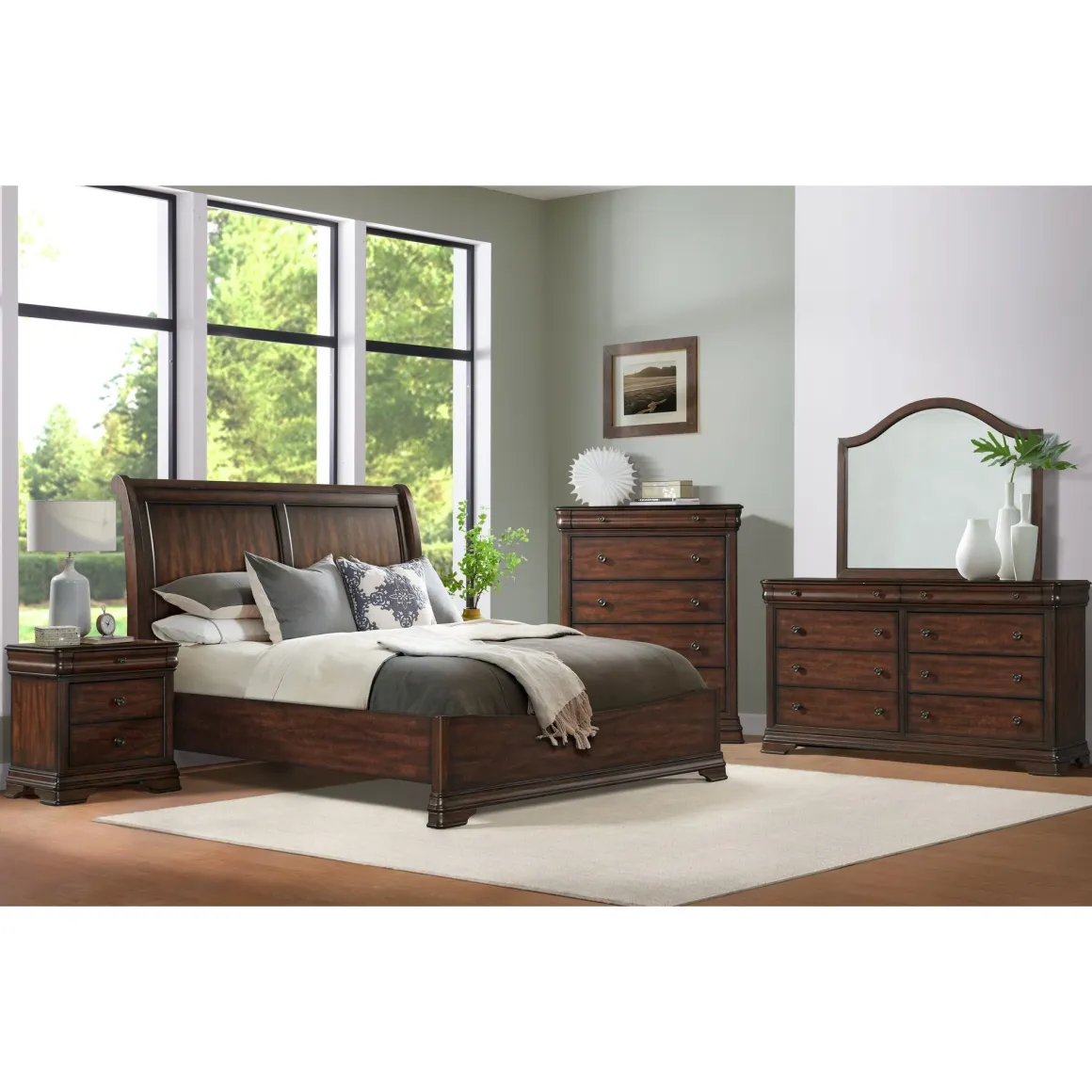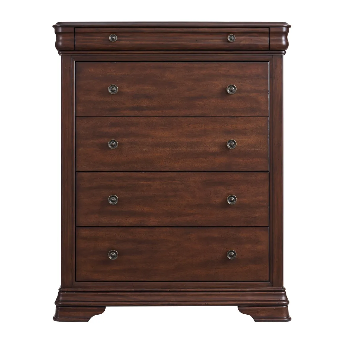 The Phillipe Collection is the epitome of elegance and sophistication. These pieces will add a touch of luxury to any bedroom. The beveled edges throughout enhance its refined look, while also offering practical features like top jewelry drawers with black felt lining to provide a safe and stylish storage solution. Crafted from fine poplar wood with a beautiful cherry finish, the Phillipe Collection is a timeless collection built to last.