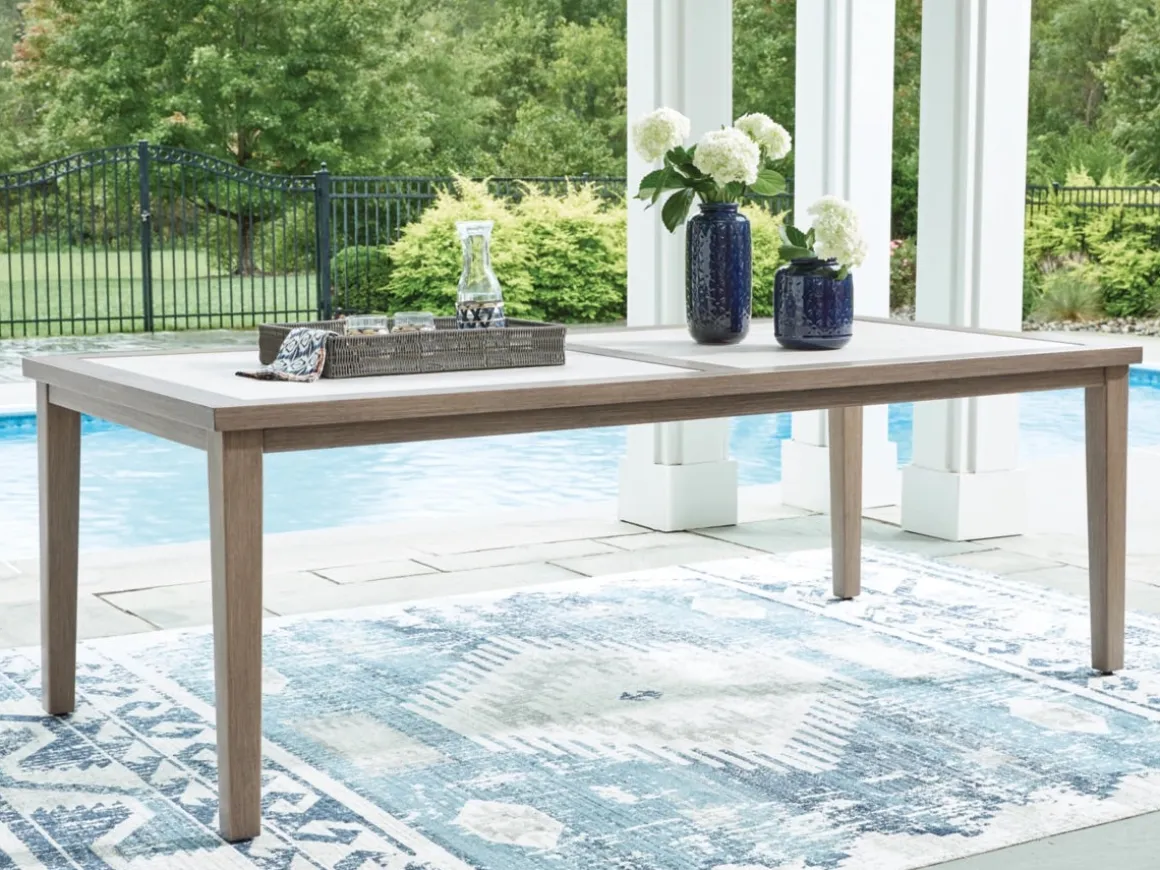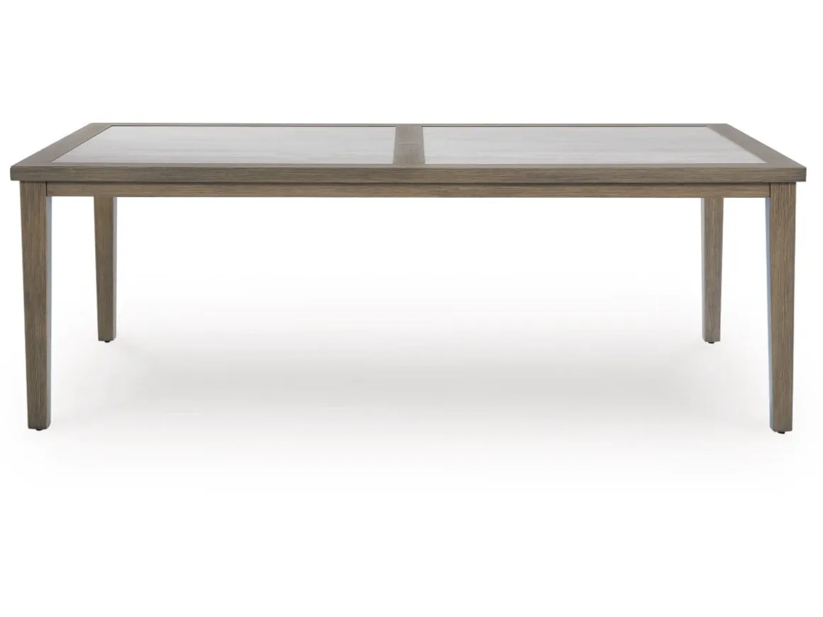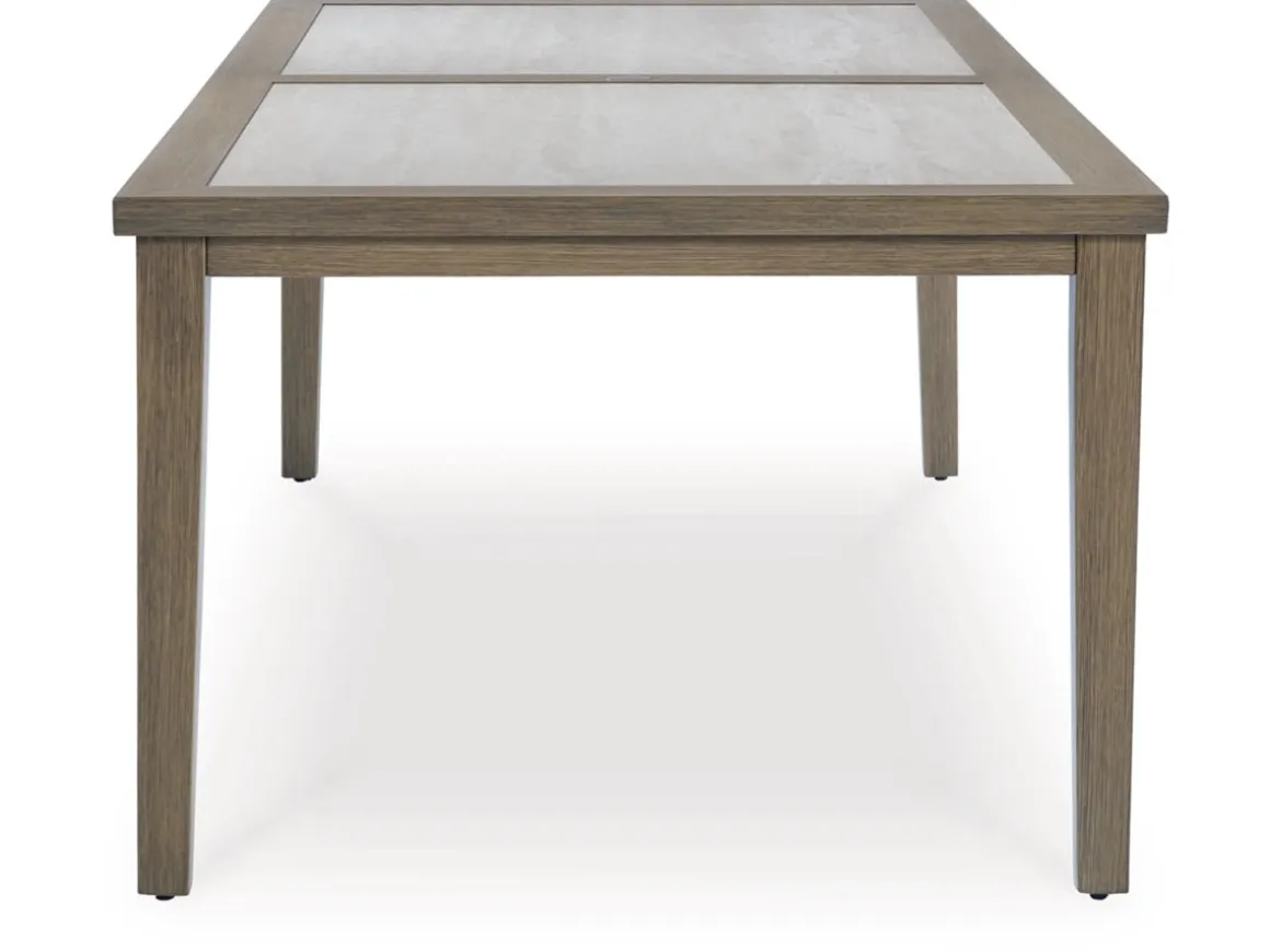 Experience the perfect combination of durability and style with the Rainier Outdoor Dining Table in Brown/Beige. An aluminum frame with a wood-look finish maintains a sleek, contemporary aesthetic, while the sintered stone tabletop adds an element of natural elegance. This delightful addition to your outdoor dining creates an oasis where comfort and beauty thrive.