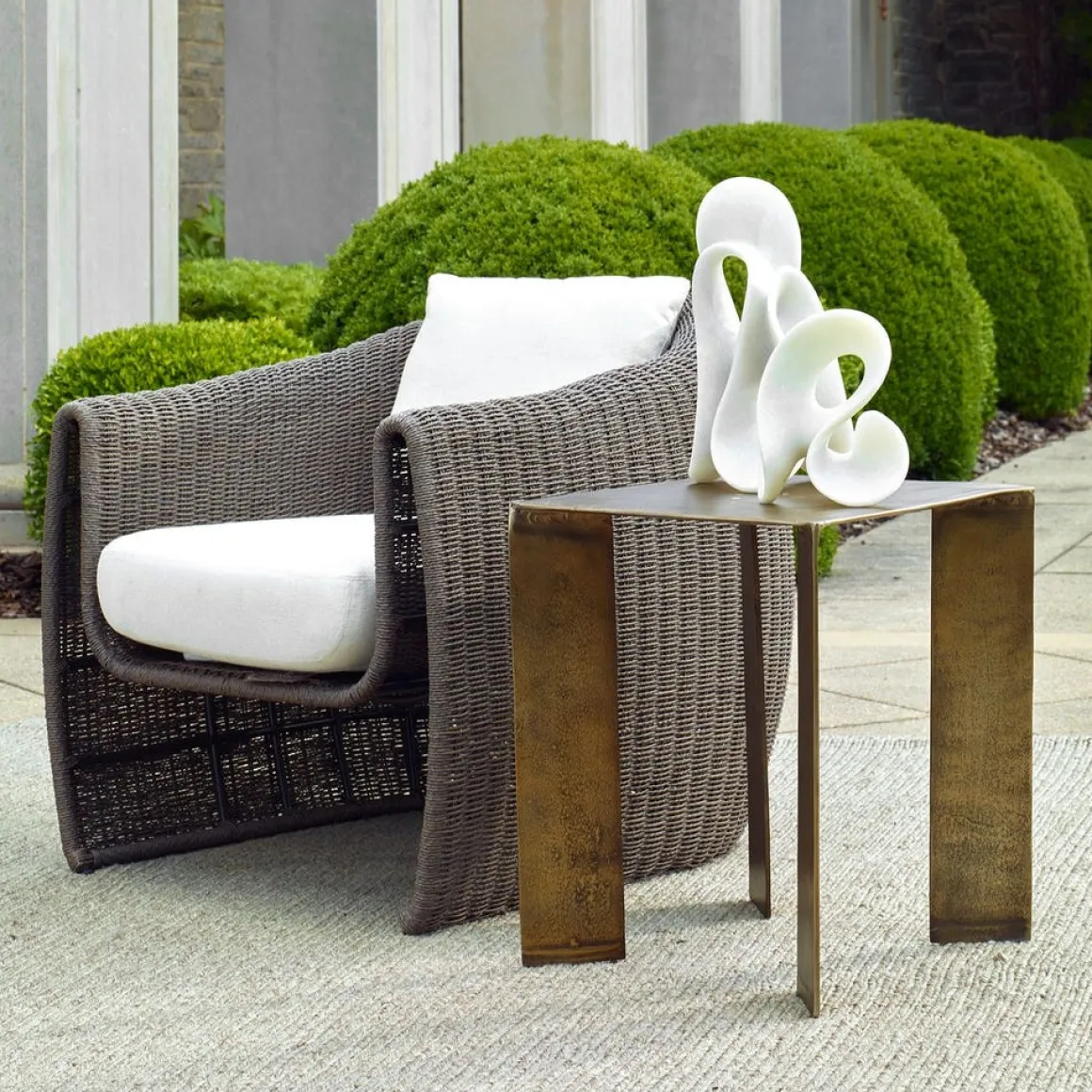 The Reade accent table features an antique brass finish on cast aluminum. Its sleek sandy texture and modern design will complement any contemporary outdoor space. Suitable for both indoor and outdoor use.