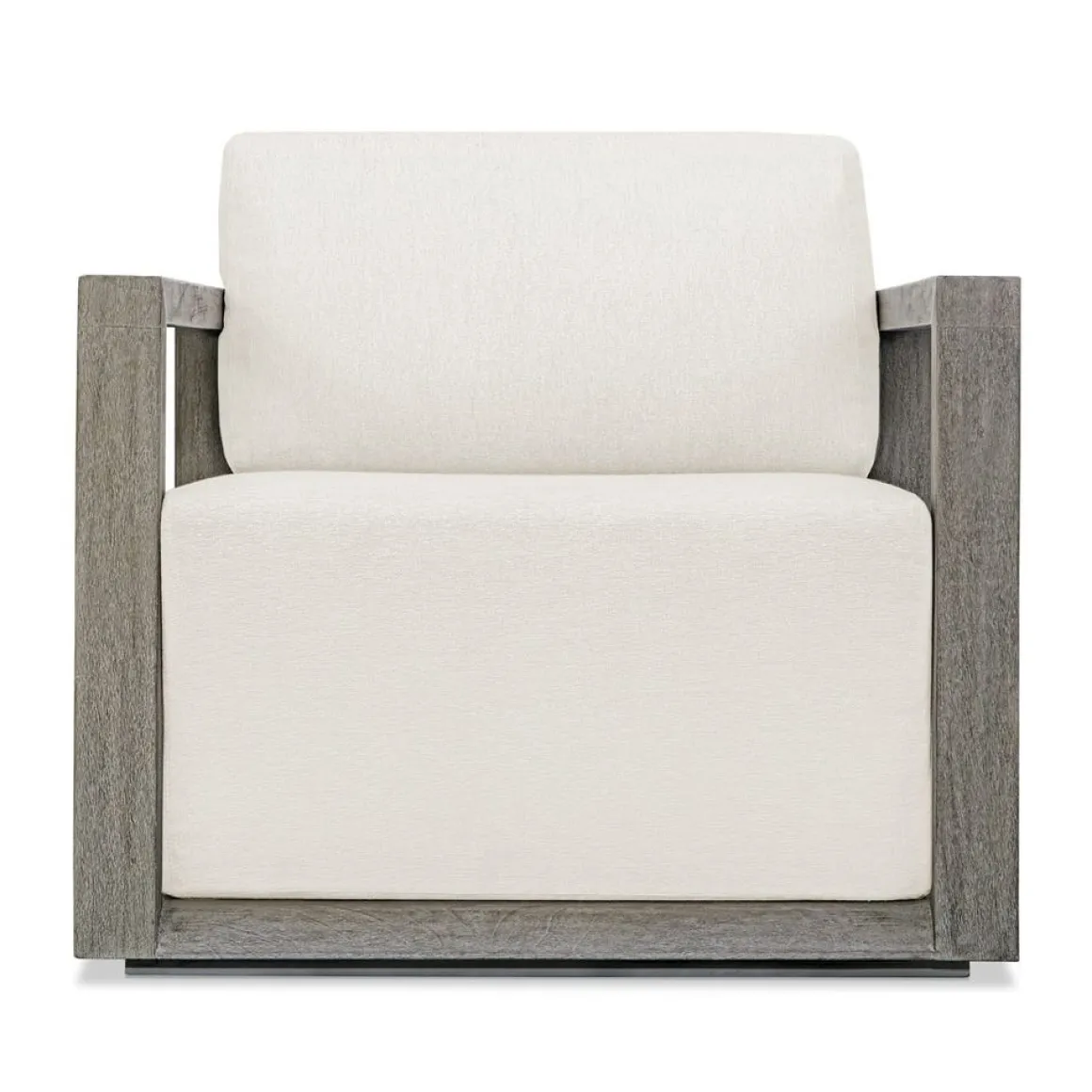The Remsen outdoor sofa features a striking architectural frame with smooth interior curves that give a sculptural presence. Constructed of solid mahogany wood in a weathered gray finish with wire-brushed details. Its generously cushioned floating seat, upholstered in an oyster white solution dyed acrylic fabric, is designed to withstand the moisture and dirt that comes with outdoor use. Solid wood will continue to move with temperature and humidity changes, which can result in cracks and uneven surfaces, adding to its authenticity and character.