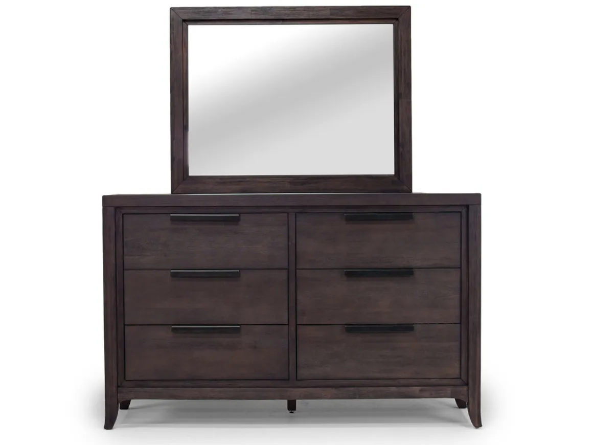 Revamp your bedroom with the luxurious and functional Riley Bookcase Bed, Dresser, Mirror & Nightstand in Carbonite, CA King set. The bed comes with an integrated bookshelf headboard and reading lamps. The mirror adds a touch of elegance with its acacia wood frame and espresso finish. The matching six-drawer dresser provides ample storage space, featuring English dovetail construction. Complete your bedroom ensemble with the Riley nightstand, featuring two drawers for additional storage. Product Details: • Solid wood frame construction • On/off switch lighting type • Six-drawer dresser and two-drawer nightstand