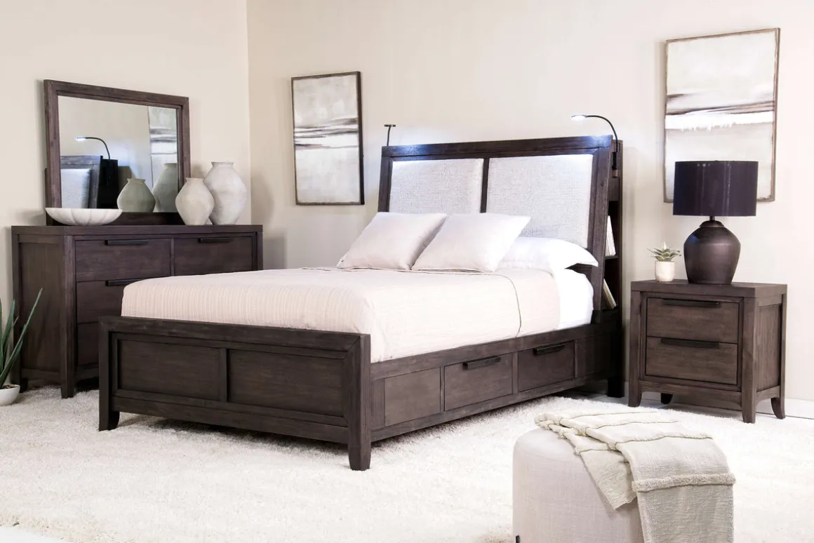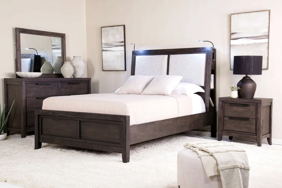 Upgrade your sleeping experience with the Riley Bookcase Bed in Carbonite, CA King. This bed blends functionality and elegance seamlessly, making it the perfect centerpiece for any transitional space. The built-in bookshelf and reading lamps offer convenience at your fingertips, ensuring you have everything you need right by your side as you unwind. And you don’t need a foundation, just place your mattress on the sturdy wood frame.Product Details:• The rich carbonite finish adds a modern touch• Enjoy the ease of on/off switch lamps for late-night reading• The tapered legs provide solid support