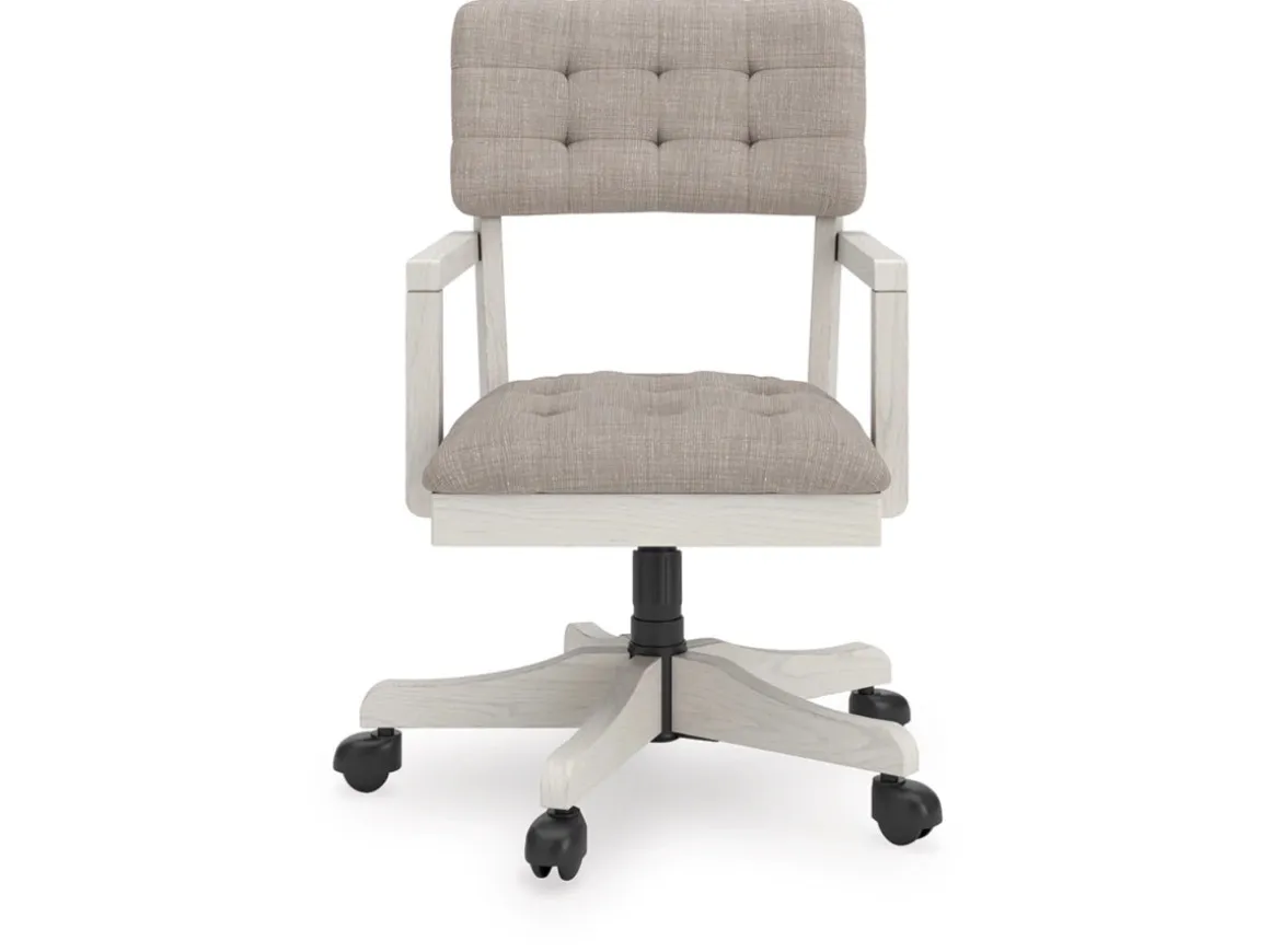 Bring classic charm and comfort to your home office with the Robbinsdale Desk Chair in Antique White. Featuring a weathered white finish and a tufted cushioned seat and back, this chair blends timeless style with everyday functionality. The adjustable height and smooth swivel base make it easy to customize your seating position, while rolling casters provide effortless mobility. Perfect for pairing with the Robbinsdale desk or any traditional workspace, this chair combines elegance, comfort, and practicality for a productive day in style.