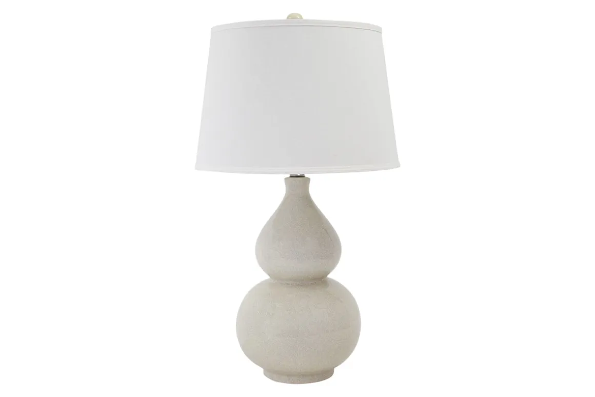 Brighten up any space with the Saffi Table Lamp. The neutral cream color looks good in any room and the modern double gourd style base has smooth lines and is finished with a crackle glaze to increase visual appeal. A fabric shade diffuses the light and makes the room look bigger. Shed some light on any subject and make you living space appear brighter and more inviting with good lighting. This lamp is just the right size for a nightstand or end table.