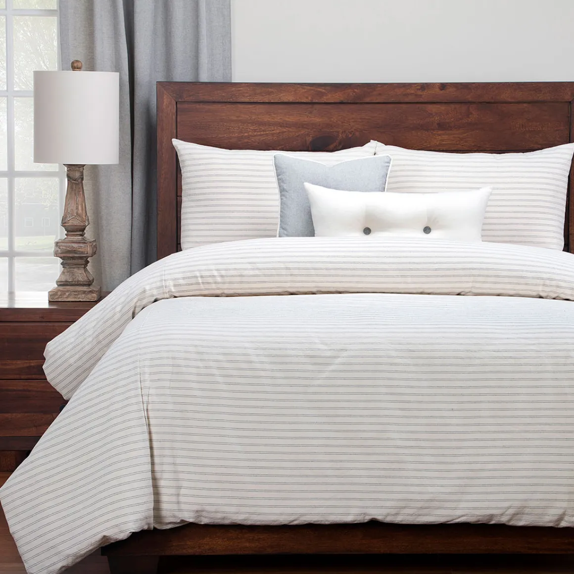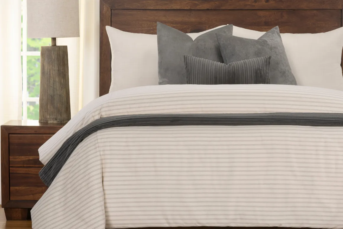 Create your own sweet respite from the world. The soft, calming colors of the Bedding Set in Pewter/Smoke/Storm/Gray, Queen bring both beauty and comfort to your bedroom. Crafted from a soft polyester blend, this duvet cover, two pillowcase shams, three huggable accent pillows and bed scarf help turn your sacred space into an inviting oasis of relaxation and sleep.Product Details:• This Queen size set brings elegant, soothing beauty to any bedroom space• Neutral hues harmonize with your existing bedroom decor• Update your space into a pleasing, calming vibe for both sleep and relaxation• Soft, comfort-centric polyester blend fabric• Zipper-closure duvet and shams• Duvet cover features eight hidden interior buttons to help hold your own comforter inside• Cut and sewn in the United StatesSet Includes:Duvet: Ticking Stripe PewterPillowcase Shams, Set of 2: Padma SmokeThrow Pillows, Set of 2: Downy StormScarf & Throw Pillow Set: Padma Harbor GrayDimensions:• Duvet: 94”W x 98”H x 3”D• Pillowcase Shams, Set of 2: 30”W x 20”H x 0.5”D• Throw Pillows, Set of 2: 20”W x 6”D x 20”H• Scarf: 80”W x 50”D x 0.5”H• Pillow: 19”W x 6”D x 11”H