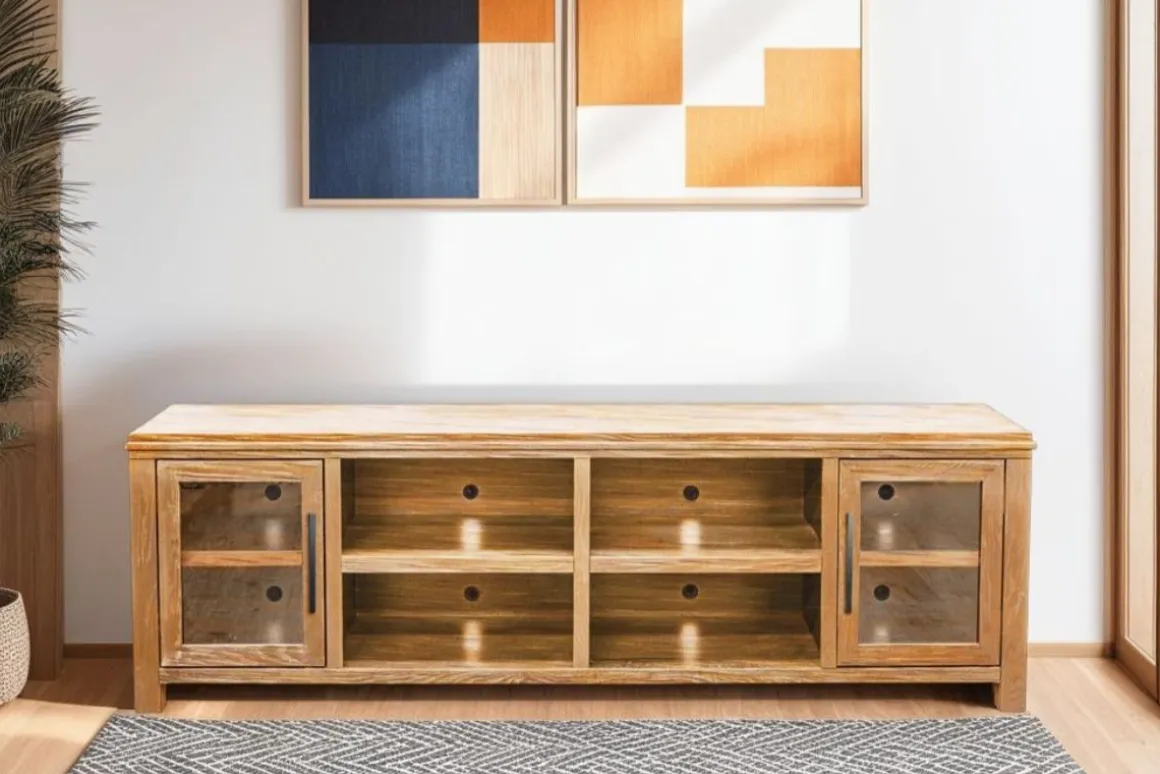 The Tybee 85″ Fireplace TV Stand, a highlight of our Designer Series, blends contemporary fashion with functionality. It supports TVs up to 95″ and features elegant Oak Solids and Veneers for a unique aesthetic.