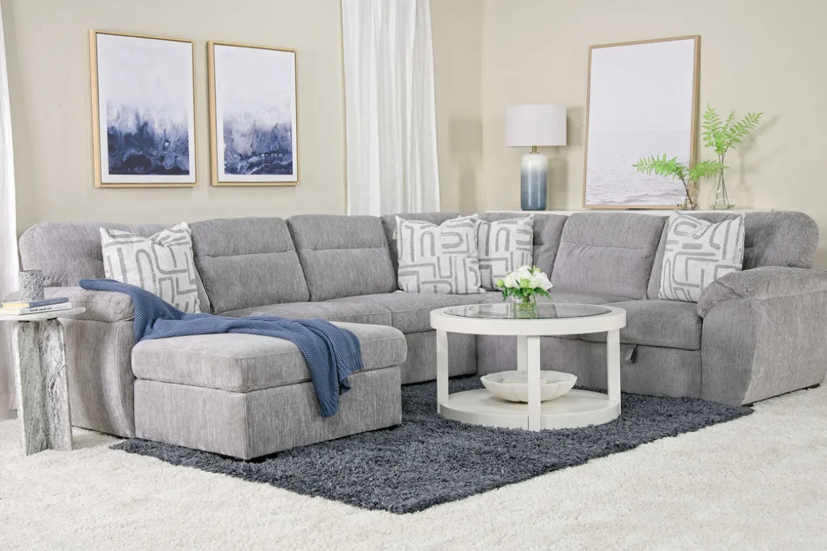 The Wanda Full Pullout Tux Storage Chaise Sectional in Gray, Left Facing, is designed to offer a perfect mix of functionality and modern style. Its full pull-out sleeper provides extra sleeping space, while the left-facing chaise features a built-in storage compartment for added convenience. The structured tuxedo frame and sleek gray upholstery elevate its contemporary appeal, making it an ideal choice for those who need both comfort and efficiency in their home.Product Details:• Full pull-out sleeper for overnight guests• Left-facing chaise with hidden storage• Tuxedo-style design with soft gray upholstery