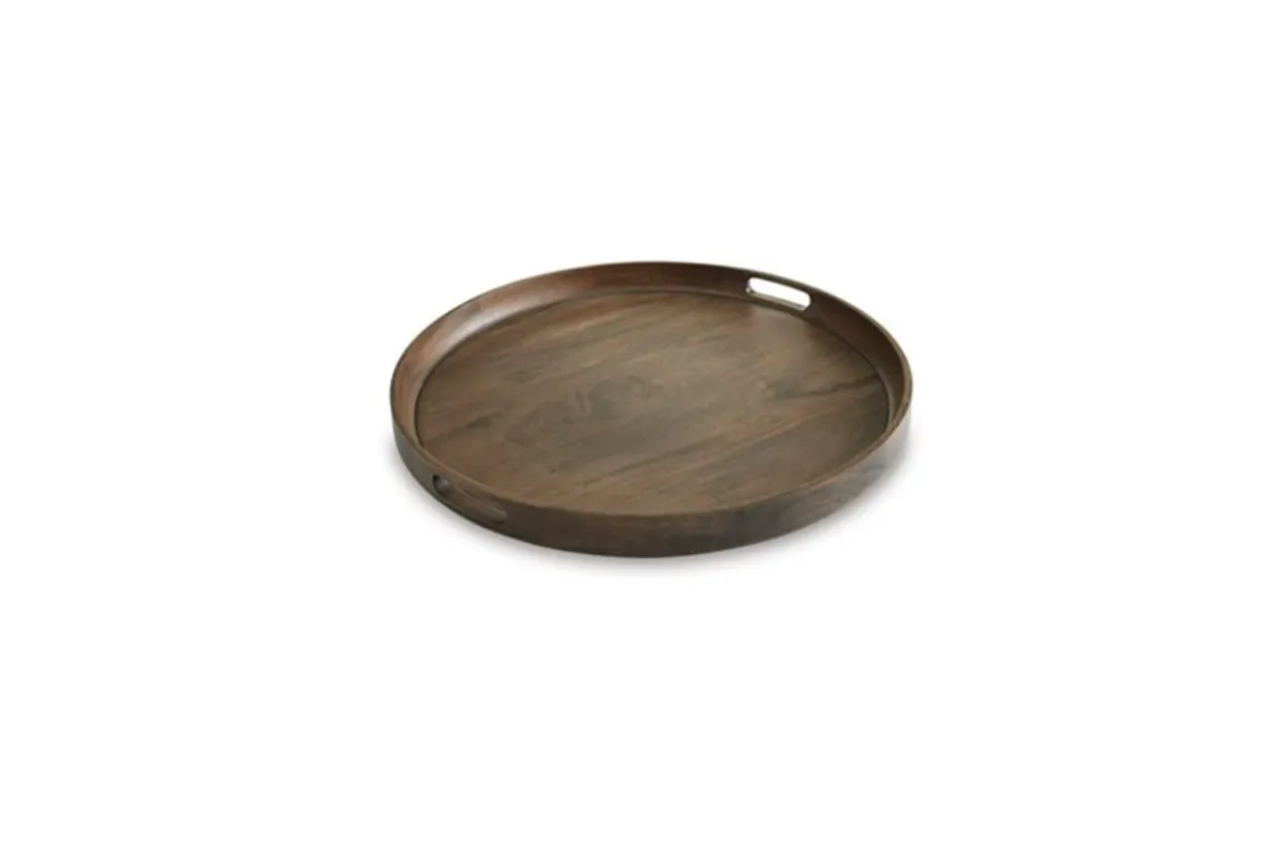 Enhance your entertaining experience with the Webbworth Tray. This round wooden tray features a sleek gray/brown finish and raised sides for secure transport of drinks and appetizers. Integrated handles offer comfortable carrying, while its understated design complements various aesthetics. Product Details: • Crafted from wood for a touch of natural style • Gray/brown finish for a versatile look • Integrated handles for easy carrying