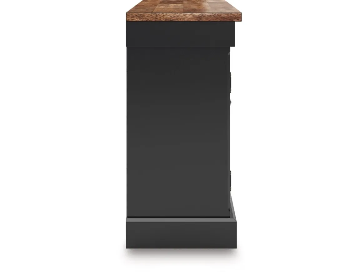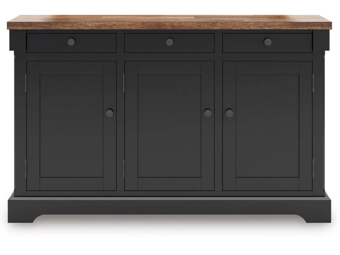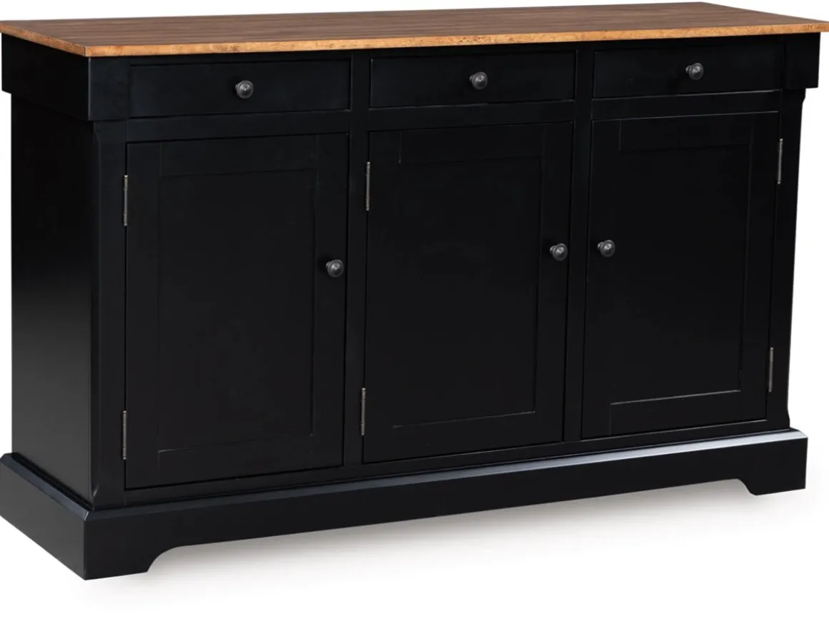 The Wildenauer Buffet in Brown/Black brings timeless charm and everyday usefulness together in one beautifully crafted piece. Its warm brown wood top adds a natural, welcoming touch, while the deep black base creates a striking contrast that works effortlessly with farmhouse, traditional, or modern classic decor. Perfect for dining rooms, living spaces, or entryways, this buffet offers generous concealed storage behind three paneled doors and convenient top drawers—keeping dishes, serveware, or family essentials neatly organized. Sturdy construction and clean lines give it lasting appeal, making it a smart, stylish addition to any home. Elevate your gathering spaces with a buffet that blends character, function, and family‑ready durability.