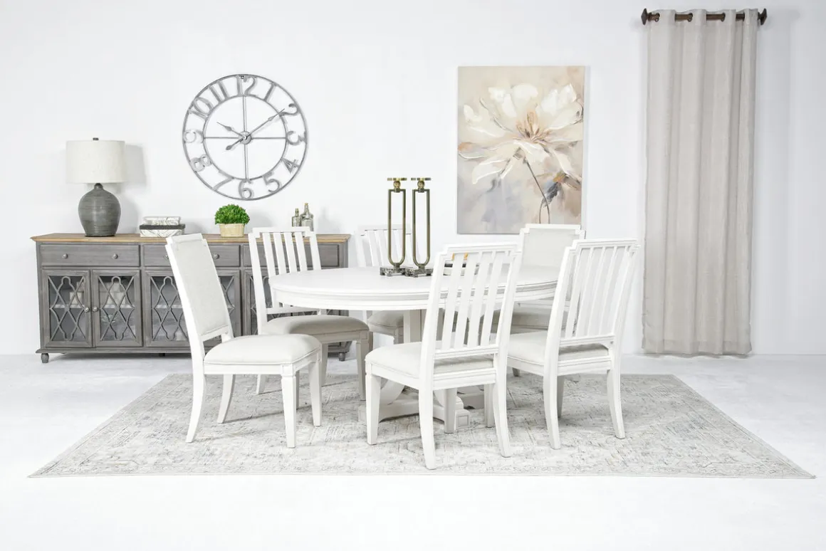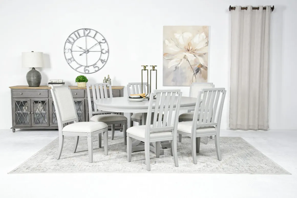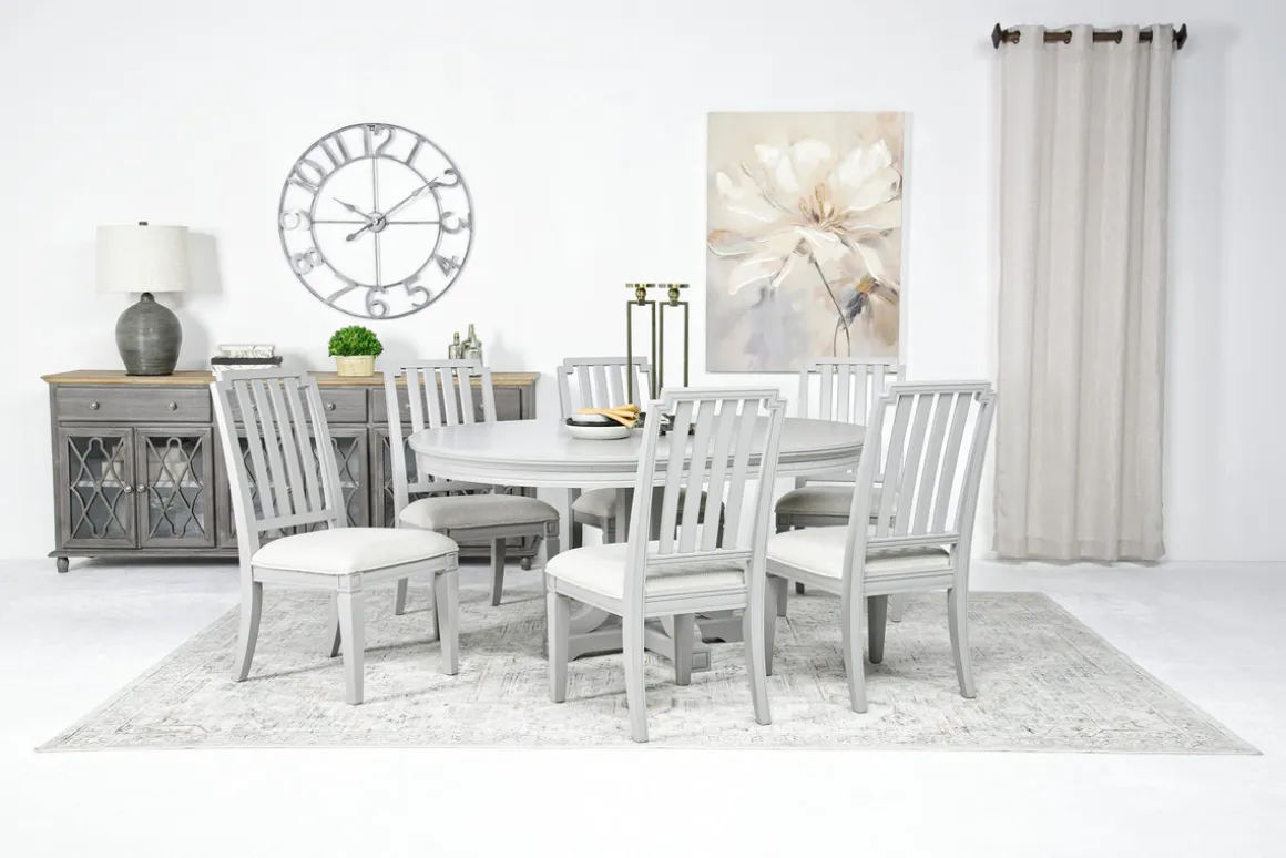 With the Willowbrook Round Dining Table & 6 Chairs in Pebble, Slat Back set, you’ll create an inviting atmosphere that encourages memorable moments and shared meals. This transitional ensemble effortlessly complements a variety of decor styles, making it an exceptional centerpiece for your dining area. The stunning table features a durable wood frame made from hardwood solids and birch veneer, ensuring lasting quality. The table comes with six chairs designed with slat backs, offering both comfort and support.Product Details:• Elegantly crafted 48-inch round table• The 18-inch removable leaf provides added flexibility• The chairs boasts straight legs and web suspension seating